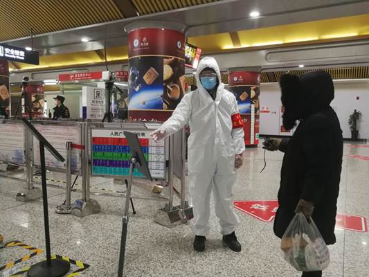2月23日星期日。第一党支部刘金在地铁一号线人民广场站点参加省直工委志愿者突击队做志愿服务(穿防护服)。
