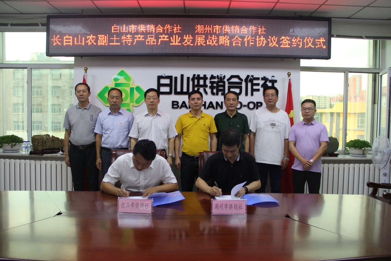 会上,白山市供销合作社与湖州市供销合作社签订了长白山农副土特产品产业发展战略合作协议,初步达成利用湖州市供销合作社所属浙北大厦集团有限公司商业连锁超市和湖州两山农产品贸易有限公司“长三角”销售网络平台,设立长白山农副土特产品专区的意向,借势发展,让更多的长白山名优特产品走进浙江和“长三角”地区。
