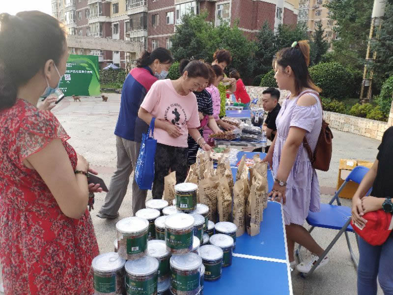 晚上5点多,临河风景小区内就热闹开了,大米、杂粮、木耳、全鹿膏、龙须茶……种类繁多的农产品一一被摆上货摊,每个展台前都围满了驻足选购的居民。