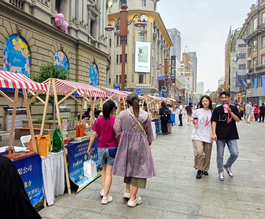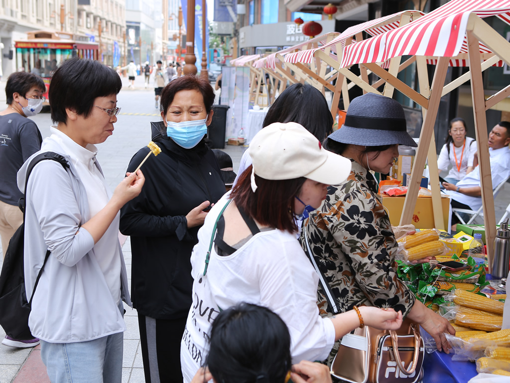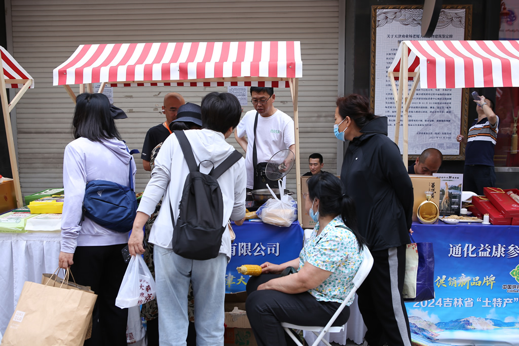 本次活动坐落在天津市著名的滨江道步行街上,活动现场彩旗飘飘、人头攒动、热闹非凡,来自全国的游客及当地市民汇聚于此,现场搭建了31个特色展台,参展企业现场制作美食供游客免费品尝,同时发放产品小样、宣传单等。活动期间,通榆县鑫域北显米业有限公司现场制作的鲜食玉米,吸引了大量观众品尝和购买;安图县仙草堂灵芝木耳人参种植专业合作社带来的灵芝孢子粉、桑黄菌深受市场欢迎;吉林省双子生态农业开发有限公司的现场烹煮大米发放试吃,吸引市民抢购;通化市金江新月花业有限公司的寒地玫瑰茶现场试喝,为炎炎夏日带来一份清凉,受到市民喜爱。吉林省供销合作社工作人员还通过现场发放“吉字号”供销特色农产品系列宣传手册和“吉地福礼”购物袋、现场播放宣传片等方式,进一步扩大了吉林省“土特产”知名度和影响力,受到当地采购商和市民的广泛赞誉和关注。
