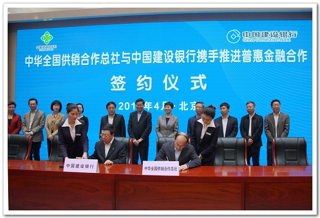 4月15日,中华全国供销合作总社与中国建设银行正式签署《普惠金融合作框架协议》,双方将利用各自的优势资源,携手创新服务模式,共同为广大农户提供全方位、便捷、优质的普惠金融服务。总社党组书记、理事会主任王侠,中国建设银行党委书记、董事长王洪章出席签约仪式并致辞。总社党组成员、理事会副主任邹天敬,中国建设银行党委委员、副行长杨文升分别代表双方签署合作协议。总社党组成员、理事会副主任,中国供销集团董事长杨建平出席签约仪式。